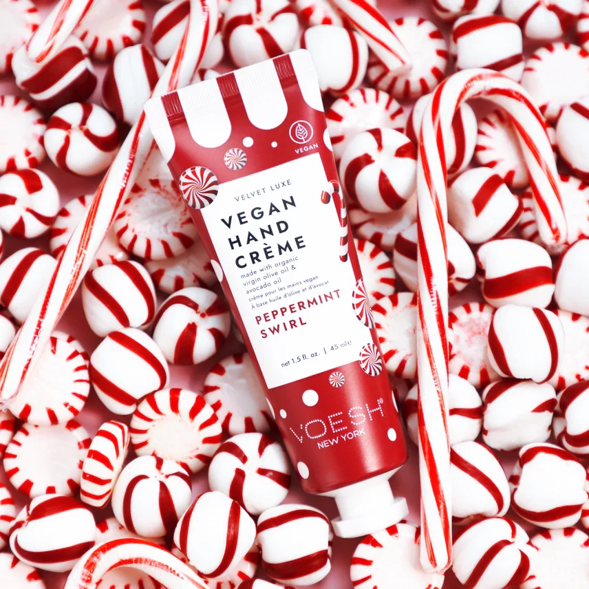 Hold din hud i perfekt stand med vores Limited Edition Peppermint Swirl Velvet Luxe Vegan hånd og Body Creme.